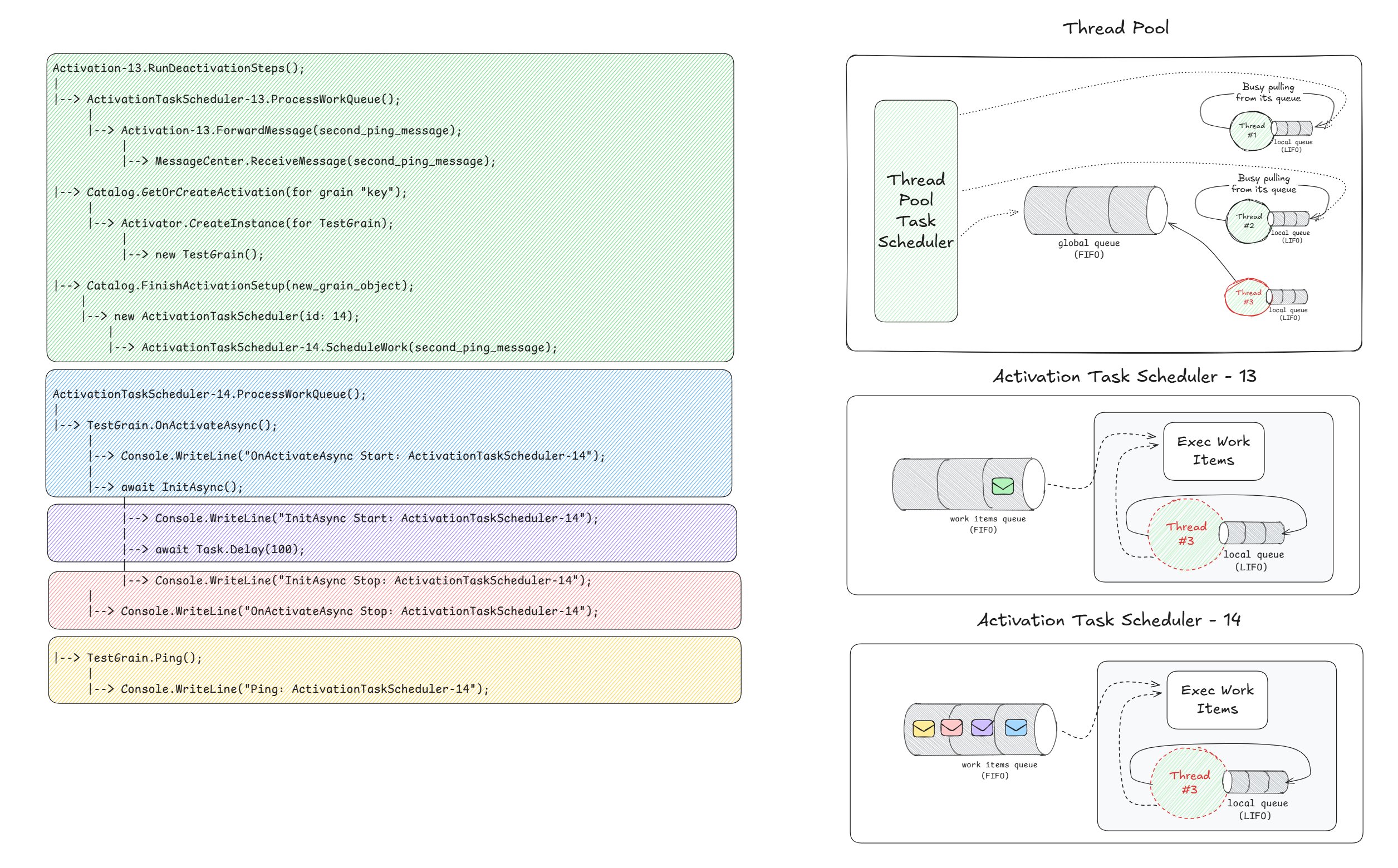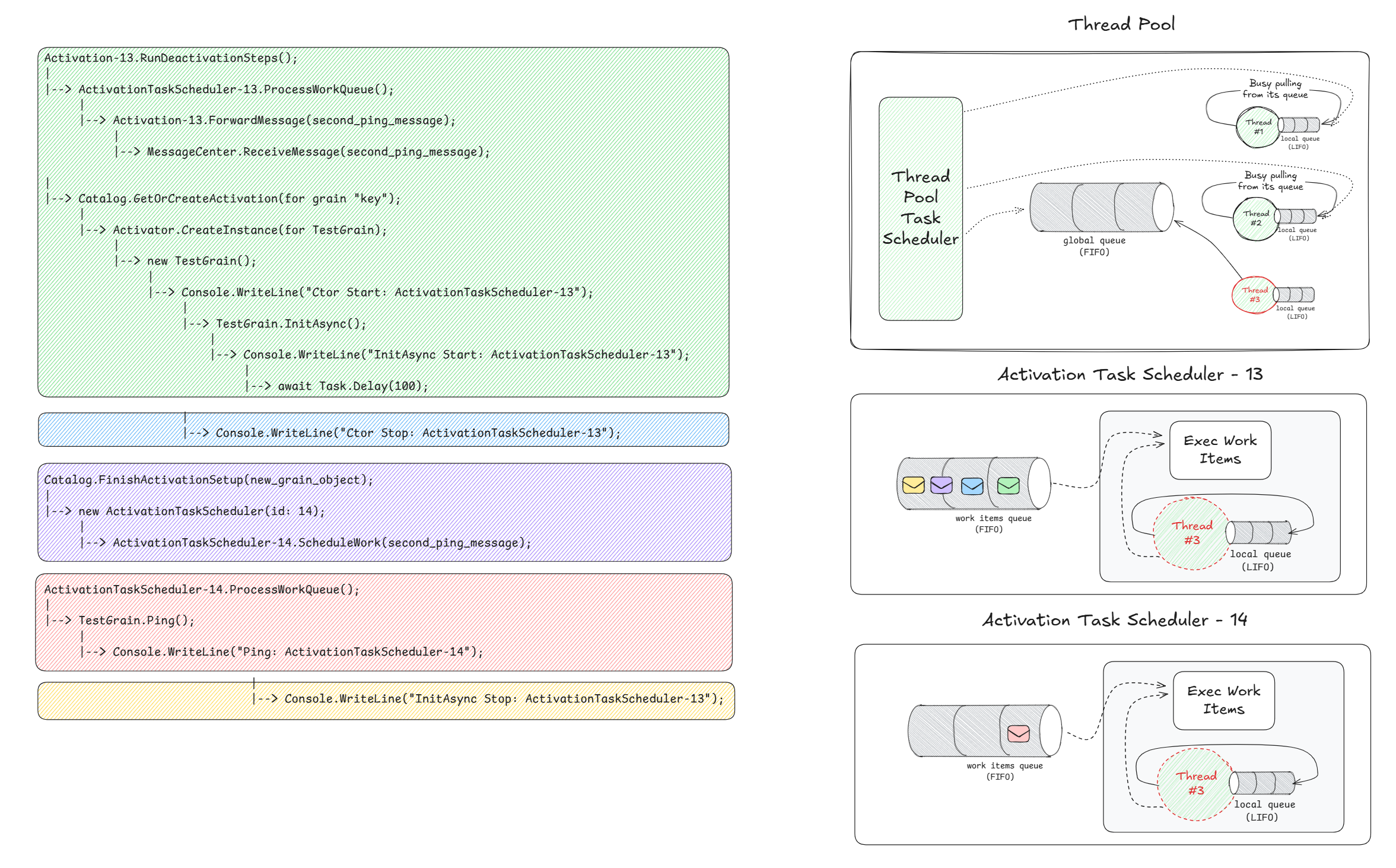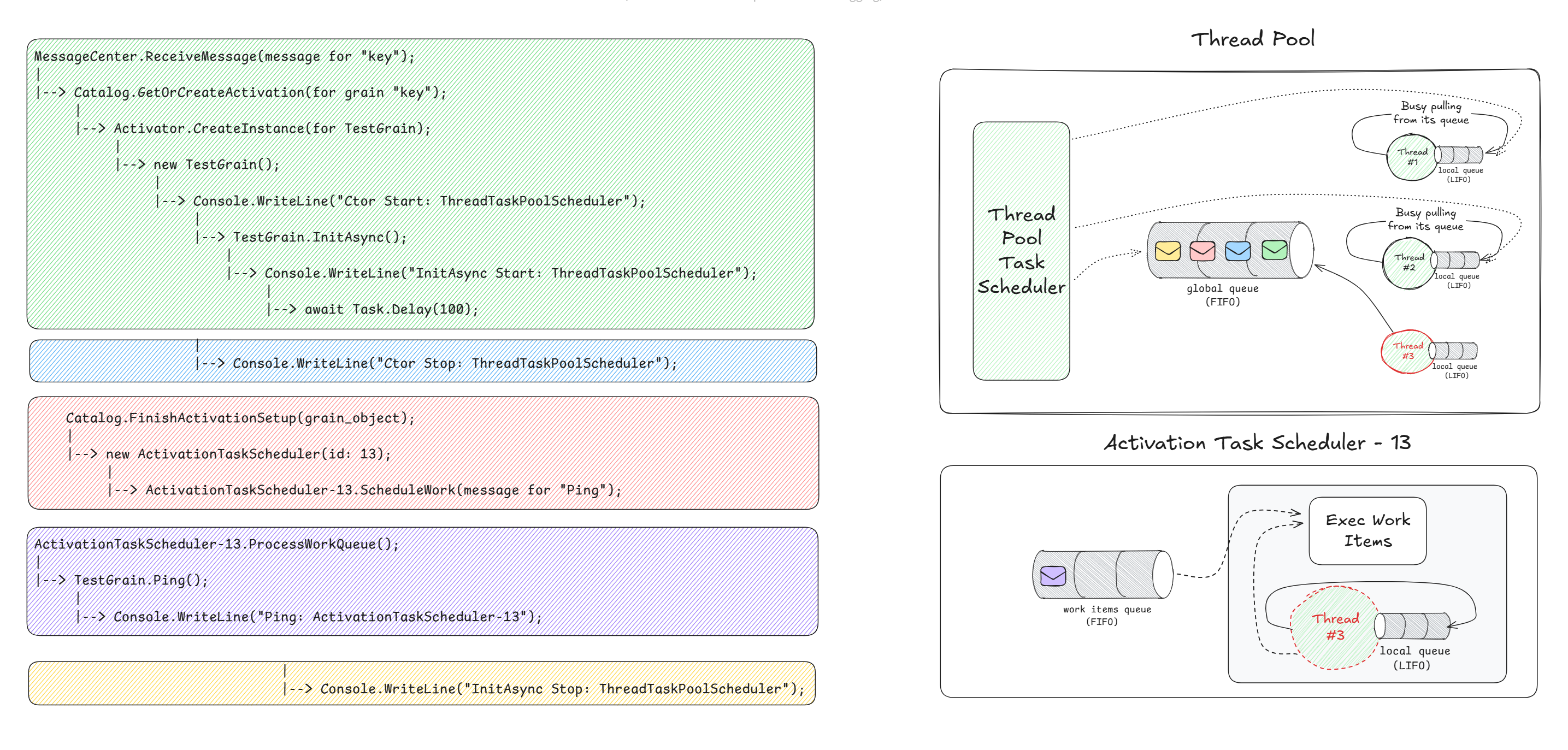 Again, pay attention to the code block coloring, the envelope's coloring, and their ordering (from left to right). Note how most of the work is being scheduled on ActivationTaskScheduler-13, as opposed to ThreadPoolTaskScheduler.
